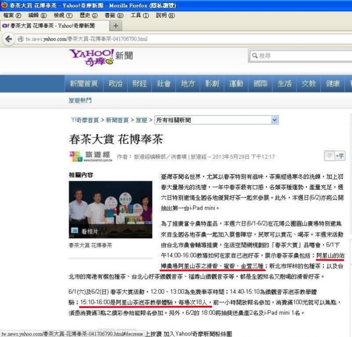圖3 YAHOO新聞針對週末春茶大賞花博奉茶進行報導